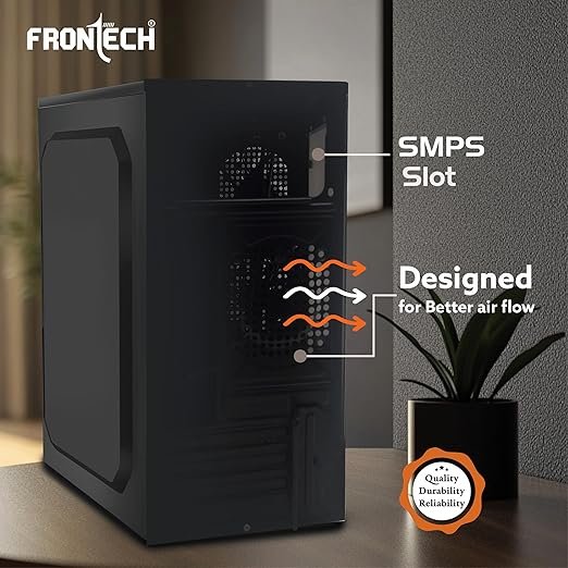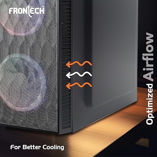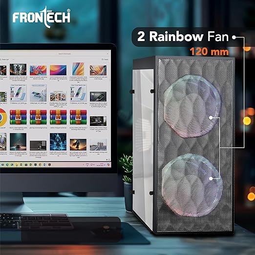Frontech Rainbow Computer Case (FT-4336) from the Silver Premium Range features a transparent side panel, prismatic iron net front panel, and dual 120mm rainbow fans for efficient cooling. It offers USB 3.0, USB 1.1, audio, and mic ports with RGB control and power buttons on the top. Compact yet durable, this case is designed for optimised airflow and reliable performance.